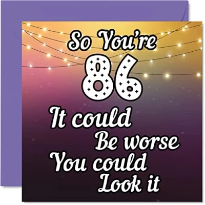 MAKE THEM SMILE WITH THIS FUN BIRTHDAY CARD: This exceptional quality birthday card for her or him shows the design "So you're 86 it could be worse you could look it". If you are looking for funny birthday cards for Woman, then then this happy birthday card is bound to make them laugh. Not just for friendship gifts for Woman this could also be for Best Friend, Work Colleague, Dad, Mum, Great Grandad, Grandpa, Nanny, Grandma, Colleague, Gran, Uncle, Auntie. WHAT DO YOU GET: The card is printed on one side and BLANK ON THE INSIDE to allow you to write your very own message. The unique fun design is printed on a specially sourced and environmentally responsible board. At 360 microns thick the natural white one-sided gloss board has a quality look and feel. Supplied with a coloured gummed envelope to complement the design and ready to be sealed and sent in the post. 86th birthday card for him, birthday card for Dad. NO INK SMUDGES: There is nothing worse than writing inside a card to find that the shiny surface makes the ink smudge. This is why we use a high quality one sided coated board. The uncoated side will absorb more of the ink from your pen to make smudging a thing of the past. Dad birthday cards, best friend birthday card, birthday card funny, rude birthday cards for Woman. SIZES: Greeting Card = 145mm x 145mm, Envelope = 155mm x 155mm, Card Thickness = 360 micron. Great friend birthday cards, male birthday card, 86th birthday card, happy birthday Mum cards, husband 86th birthday cards, stepdad birthday card. MADE AND QUALITY CHECKED IN THE UK: We print and manufacture all our product right her in the UK so you can be sure of a fast turnaround and a product that is expertly made. Using environmentally responsible premium board our card is conscious of the responsible management of the world's forests - 86th birthday cards for Men, Mens birthday cards, oldi card.