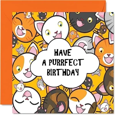 MAKE THEM SMILE WITH THIS PAW-SOME BIRTHDAY CARD: This exceptional quality birthday card for her shows the design of a load of cartoon cats with the wording "Have A Purrfect Birthday". If you are looking for fun birthday cards for men and women, then this happy birthday card is bound to make them smile.This could also be for Best Friend, Work Colleague, Mum, Dad, Brother, Uncle, Colleague, Sister, Cousin or Auntie. WHAT DO YOU GET: The card is printed on one side and BLANK ON THE INSIDE to allow you to write your very own message. The unique cheeky design is printed on a specially sourced and environmentally responsible board. At 360 microns thick the natural white one-sided gloss board has a quality look and feel. Supplied with a coloured gummed envelope to complement the design and ready to be sealed and sent in the post. NO INK SMUDGES: There is nothing worse than writing inside a card to find that the shiny surface makes the ink smudge. This is why we use a high quality one sided coated board. The uncoated side will absorb more of the ink from your pen to make smudging a thing of the past. SIZES: Greeting Card = 145mm x 145mm, Envelope = 155mm x 155mm, Card Thickness = 360 micron. MADE AND QUALITY CHECKED IN THE UK: We print and manufacture all our product right her in the UK so you can be sure of a fast turnaround and a product that is expertly made. Using environmentally responsible premium board our card is conscious of the responsible management of the world's forests.