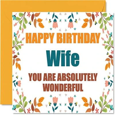 MAKE YOUR WIFE SMILE WITH THIS HEARTFELT HAPPY BIRTHDAY CARD Wife: This exceptional quality birthday card for her shows the design "Happy Birthday Wife You Are Absolutely Wonderful". If you are looking for beautiful birthday greetings cards for her, then this happy birthday card is bound to make them laugh. Not just for birthday gifts for Wife this could also be an Anniversary card or Valentines Day card for Wife. WHAT DO YOU GET: The card is printed on one side and BLANK ON THE INSIDE to allow you to write your very own message. The unique fun design is printed on a specially sourced and environmentally responsible board. At 360 microns thick the natural white one-sided gloss board has a quality look and feel. Supplied with a coloured gummed envelope to complement the design and ready to be sealed and sent in the post. NO INK SMUDGES: There is nothing worse than writing inside a card to find that the shiny surface makes the ink smudge. This is why we use a high quality one sided coated board. The uncoated side will absorb more of the ink from your pen to make smudging a thing of the past. Happy birthday Wife cards, Wife birthday cards. SIZES: Greeting Card = 145mm x 145mm, Envelope = 155mm x 155mm, Card Thickness = 360 micron. Great Wife birthday cards from Husband or Partner. Wife birthday cards from Husband, birthday cards for Wife, birthday card Wife, Wife birthday cards from partner, Wife cards birthday, special Wife birthday cards, Wife 30th birthday card, birthday card Wife from Husband. MADE AND QUALITY CHECKED IN THE UK: We print and manufacture all our product right him in the UK so you can be sure of a fast turnaround and a product that is expertly made. Using environmentally responsible premium board our card is conscious of the responsible management of the world's forests - birthday cards Wife, birthday card Wife, Wives birthday card.