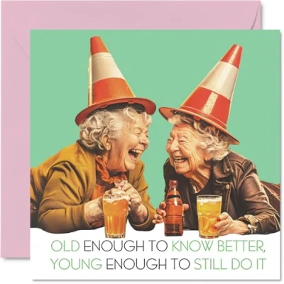 MAKE THEM LAUGH WITH THIS FUNNY BIRTHDAY CARD: This exceptional quality playful birthday card shows an amusing design of two older ladies lying on the floor drinking beer with traffic cones on their heads with the phrase "Old enough to know better, young enough to still do it". If you are looking for fun birthday cards ,then this card is bound to make them chuckle. This could also be for Best Friend, Work Colleague, Mum, Sister, Cousin, Auntie or Friend. What's Inside - the vibrant style theme continues inside with the simple words "Happy Birthday" - as seen in the second image. There's ample space for your own personal message. Crafted on a 360-micron thick, environmentally responsible board, this one-sided gloss board offers a luxurious look and feel. Paired with a colored gummed envelope that complements the design, it's ready to be sealed and sent, making it a truly special gesture. NO INK SMUDGES: There is nothing worse than writing inside a card to find that the shiny surface makes the ink smudge. This is why we use a high quality one sided coated board. The uncoated side will absorb more of the ink from your pen to make smudging a thing of the past. SIZES: Greeting Card = 145mm x 145mm, Envelope = 155mm x 155mm, Card Thickness = 360 micron. Great friend birthday cards, female birthday card, 60th birthday card, happy birthday Mum cards, Wife 50th birthday cards, stepmum birthday card. MADE AND QUALITY CHECKED IN THE UK: We print and manufacture all our product right her in the UK so you can be sure of a fast turnaround and a product that is expertly made. Using environmentally responsible premium board our card is conscious of the responsible management of the world's forests.