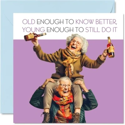 MAKE THEM LAUGH WITH THIS FUNNY BIRTHDAY CARD: This exceptional quality playful birthday card shows an amusing design of an older lady on the shoulders of another older lady with beer bottles in her hands with the phrase "Old enough to know better, young enough to still do it". If you are looking for fun birthday cards ,then this card is bound to make them chuckle. This could also be for Best Friend, Work Colleague, Mum, Sister, Cousin, Auntie or Friend. What's Inside - the vibrant style theme continues inside with the simple words "Happy Birthday" - as seen in the second image. There's ample space for your own personal message. Crafted on a 360-micron thick, environmentally responsible board, this one-sided gloss board offers a luxurious look and feel. Paired with a colored gummed envelope that complements the design, it's ready to be sealed and sent, making it a truly special gesture. NO INK SMUDGES: There is nothing worse than writing inside a card to find that the shiny surface makes the ink smudge. This is why we use a high quality one sided coated board. The uncoated side will absorb more of the ink from your pen to make smudging a thing of the past. SIZES: Greeting Card = 145mm x 145mm, Envelope = 155mm x 155mm, Card Thickness = 360 micron. Great friend birthday cards, female birthday card, 60th birthday card, happy birthday Mum cards, Wife 50th birthday cards, stepmum birthday card. MADE AND QUALITY CHECKED IN THE UK: We print and manufacture all our product right her in the UK so you can be sure of a fast turnaround and a product that is expertly made. Using environmentally responsible premium board our card is conscious of the responsible management of the world's forests.