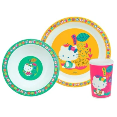 This microwavable meal set includes a flat plate diameter 22 cm, a bowl diameter 16 cm and a glass 220 ml specially designed for children He will surely finish his plate or bowl to find his favourite character Make meal time full of fun A great gift idea that children and parents will also love