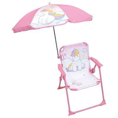 Children's unicorn folding chair: This pretty pink chair decorated with unicorns is perfectly suitable for children from 3 years old. Ideal for the garden, patio or holiday, it creates a soft and magical space to rest or play. Matching parasol for sheltering from the sun: accompanied by a parasol Ø65 cm matching the unicorn theme, this chair allows the child to enjoy the outdoors while remaining protected from the sun. Perfect for sunny days! LIGHTWEIGHT, FOLDABLE AND EASY TO CARRY: Easily foldable and very light, this chair can be easily transported to the beach, picnic or grandparents' house. It folds out in a blink of an eye and stores effortlessly. COMFORT AND SAFETY FOR CHILDREN: Designed especially for the little ones, it offers a stable and comfortable seat, with a maximum capacity of 30 kg. Use on a flat surface and always under adult supervision. CHILD GIFT IDEA FOR SUMMER: An enchanted folding chair to create an outdoor relaxation area. Designed by Fun House, a French family brand known for its quality children's furniture and playful design.