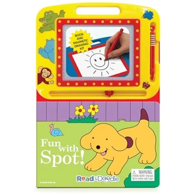 Fun with Spot Read & Doodle Learning resources for kids, a magnetic drawing pad, an easy to use pen, 22 page board book reading and