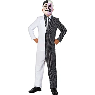 🔴 Includes: Costume for kids. Jacket with incorporated shirt and tie, trousers, mask, coin. Color White. Made of 100 Polyester 🟠Size: 10 - 12 years. If you are very tall or plus size, or if you’re stuck between two sizes, we would recommend you choose the larger size as they are meant to be loose fitting. 🟡 At FUNIDELIA we design the most unique costumes for your best parties. Our brand, Made By Funidelia, guarantees exclusivity and quality. Identifying the products most in demand means we can manufacture them quickly and exclusively, offering the best value for money for products from the biggest licenses in the world. 🟢 Costumes Two-Face 100% OFFICIALLY LICENSED different and unique for Carnaval, Halloween, themed parties or birthdays. Outfit Superheroes & DC Comics to have fun dressed up as Villains. 🔵 The most unique and fun costume: Become Harvey Dent himself! TWOFACE DC COMICS COSTUME for boy to turn you into Gotham’s two-faced villain. Have Fun!, Manufacturer: Funiglobal
