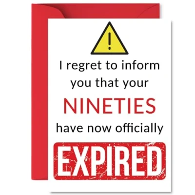 MAKE THEM LAUGH WITH THIS HILARIOUS HAPPY BIRTHDAY CARD: This exceptional quality birthday card for her shows the design 'I regret to inform you that your Nineties have now officially expired". If you are looking for beautiful birthday greetings cards for her or him, then this funny happy birthday card is bound to make them smile. Not just for birthday gifts for her this could also be a birthday card for your Great Grandpa, Nana, Gramps, Step Uncle or Auntie. WHAT DO YOU GET: The card is printed on one side and BLANK ON THE INSIDE to allow you to write your very own message. The unique fun design is printed on a specially sourced and environmentally responsible board. At 360 microns thick the natural white one-sided gloss board has a quality look and feel. Supplied with a coloured gummed envelope to complement the design and ready to be sealed and sent in the post. NO INK SMUDGES: There is nothing worse than writing inside a card to find that the shiny surface makes the ink smudge. This is why we use a high quality one sided coated board. The uncoated side will absorb more of the ink from your pen to make smudging a thing of the past. Happy birthday cards, Great Grandad birthday card, Great Grandma birthday cards, 100th birthday card for women, 100th birthday cards for men. SIZES: Greeting Card = 148mm x 210mm, Envelope = 150mm x 212mm, Card Thickness = 360 micron. Great Grandad birthday cards from Great Grandson and Great Granddaughter. Great Grandma birthday cards from Grandson, birthday card Great Granny, Granny birthday card, Grandpa birthday cards from Great Granddaughter, special Grandparent birthday cards, Nanny card. MADE AND QUALITY CHECKED IN THE UK: We print and manufacture all our product right her in the UK so you can be sure of a fast turnaround and a product that is expertly made. Using the very best premium board our card is conscious of the responsible management of the world's forests.