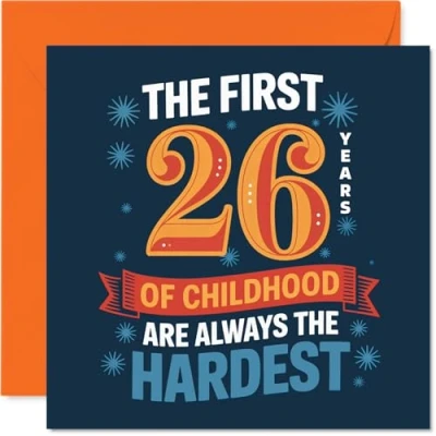 Celebrates that 'grown up' feeling with the cheeky line: THE FIRST 26 YEARS OF CHILDHOOD ARE ALWAYS THE HARDEST - ideal for anyone who still isn't quite adulting Features punchy typography and a vibrant blue and orange palette, giving this card a playful. modern edge that stands out on any mantelpiece Printed on quality gloss single sided board with an uncoated inside. No smudging when writing inside. Made using FSC board for an eco-friendly touch Blank inside so you can add your own message or private joke. Comes complete with an envelope, ready for giving. The 145mm Square format is convenient to display or post Designed and printed in the UK, this card is recyclable - so it's a little kinder to the planet as well as your favourite 26-year-old. Ideal for a mum or dad celebrating a milestone birthday