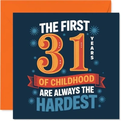 Brings a grin with its cheeky 'THE FIRST 31 YEARS OF CHILDHOOD ARE ALWAYS THE HARDEST' message, set in lively, bold type for maximum impact. Birthday card with a light-hearted design style Features a vibrant blue and orange motif, creating a standout look that captures the fun and mischief of celebrating another year. Recyclable; printed in UK for a considerate choice Crafted from glossy single sided board with an uncoated inside-no smudging when writing inside. Made using FSC-certified board and fully recyclable materials Blank inside, so you can personalise your own message. Comes with a matching envelope for easy gifting. The 145mm Square format is convenient to display or post Designed and printed in the UK for brilliant quality-perfect for anyone who doesn't take birthdays too seriously. Ideal for a mum or dad celebrating a milestone birthday
