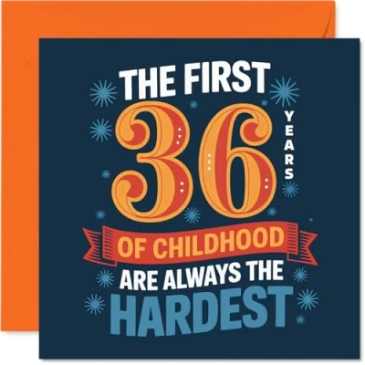 Hits the funny bone by poking fun at never really growing up, with the line 'THE FIRST 36 YEARS OF CHILDHOOD ARE ALWAYS THE HARDEST' front and centre Features a vibrant blue and orange palette with striking typography, making it a standout on any mantelpiece or desk. Recyclable; printed in UK for a considerate choice Printed on quality gloss single sided board with an uncoated inside-no smudging when writing inside. Fully recyclable and made with FSC-certified board Blank inside so you can pen your own witty message or heartfelt note. Comes with a matching envelope for easy gifting. The 145mm Square format is convenient to display or post Printed here in the UK with care, this card is perfect when you want to give a proper laugh and a quality feel-no flimsy nonsense. Ideal for a mum or dad celebrating a milestone birthday