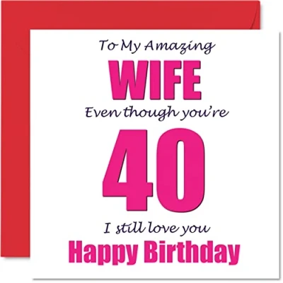 MAKE YOUR WIFE SMILE WITH THIS HILARIOUS HAPPY BIRTHDAY CARD Wife: This exceptional quality birthday card for her shows the design 'To My Amazing Wife even though you're 40 I still love you Happy birthday'. If you are looking for beautiful birthday greetings cards for her, then this happy birthday card is bound to make them laugh. Not just for birthday gifts for Wife this could also be an Anniversary card or Valentines Day card for Wife. WHAT DO YOU GET: The card is printed on one side and BLANK ON THE INSIDE to allow you to write your very own message. The unique fun design is printed on a specially sourced and environmentally responsible board. At 360 microns thick the natural white one-sided gloss board has a quality look and feel. Supplied with a coloured gummed envelope to complement the design and ready to be sealed and sent in the post. NO INK SMUDGES: There is nothing worse than writing inside a card to find that the shiny surface makes the ink smudge. This is why we use a high quality one sided coated board. The uncoated side will absorb more of the ink from your pen to make smudging a thing of the past. Happy birthday Wife cards, Wifey birthday cards.40th Birthday card for Wife, retirement card, female birthday cards. SIZES: Greeting Card = 145mm x 145mm, Envelope = 155mm x 155mm, Card Thickness = 360 micron. Great Wife birthday cards from Husband or Partner. Wife birthday cards from Husband, birthday cards for Wife, birthday card Wife, Wife birthday cards from partner, Wife cards birthday, special Wife birthday cards, Wife 40th birthday card, birthday card Wife from Husband. MADE AND QUALITY CHECKED IN THE UK: We print and manufacture all our product right him in the UK so you can be sure of a fast turnaround and a product that is expertly made. Using environmentally responsible premium board our card is conscious of the responsible management of the world's forests - birthday cards Wife, birthday card Wife, Wives birthday card.