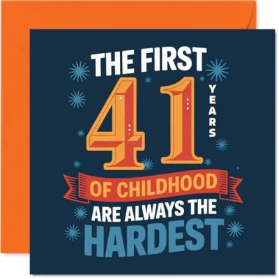 Playfully pokes fun at turning 41 with the witty line: 'The first 41 years of childhood are always the hardest', making it a real mood-lifter Features a striking colour combo of blue, orange, and navy, with bold, attention-grabbing typography for a modern, cheerful look. Recyclable; printed in UK for a considerate choice Printed on quality gloss single sided board with an uncoated inside-no smudging when writing inside. Fully recyclable and made with FSC board Blank inside, so you can personalise your message. Comes with a coordinating envelope for easy gifting. The 145mm Square format is convenient to display or post Designed and printed in the UK, this card is ideal for anyone who enjoys clever humour and a light-hearted birthday greeting. Ideal for a mum or dad celebrating a milestone birthday