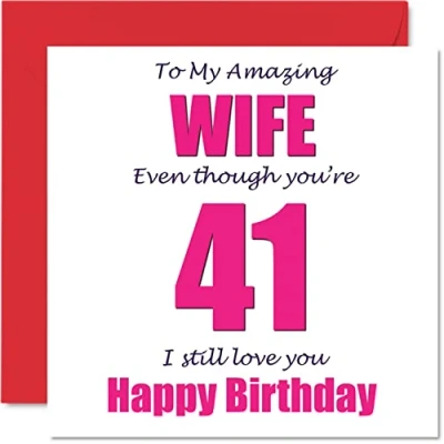 MAKE YOUR WIFE SMILE WITH THIS HILARIOUS HAPPY BIRTHDAY CARD Wife: This exceptional quality birthday card for her shows the design 'To My Amazing Wife even though you're 41 I still love you Happy birthday'. If you are looking for beautiful birthday greetings cards for her, then this happy birthday card is bound to make them laugh. Not just for birthday gifts for Wife this could also be an Anniversary card or Valentines Day card for Wife. WHAT DO YOU GET: The card is printed on one side and BLANK ON THE INSIDE to allow you to write your very own message. The unique fun design is printed on a specially sourced and environmentally responsible board. At 360 microns thick the natural white one-sided gloss board has a quality look and feel. Supplied with a coloured gummed envelope to complement the design and ready to be sealed and sent in the post. NO INK SMUDGES: There is nothing worse than writing inside a card to find that the shiny surface makes the ink smudge. This is why we use a high quality one sided coated board. The uncoated side will absorb more of the ink from your pen to make smudging a thing of the past. Happy birthday Wife cards, Wifey birthday cards.41st Birthday card for Wife, retirement card, female birthday cards. SIZES: Greeting Card = 145mm x 145mm, Envelope = 155mm x 155mm, Card Thickness = 360 micron. Great Wife birthday cards from Husband or Partner. Wife birthday cards from Husband, birthday cards for Wife, birthday card Wife, Wife birthday cards from partner, Wife cards birthday, special Wife birthday cards, Wife 41st birthday card, birthday card Wife from Husband. MADE AND QUALITY CHECKED IN THE UK: We print and manufacture all our product right him in the UK so you can be sure of a fast turnaround and a product that is expertly made. Using environmentally responsible premium board our card is conscious of the responsible management of the world's forests - birthday cards Wife, birthday card Wife, Wives birthday card.