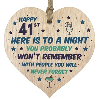 MAKE THEM SMILE ON THEIR SPECIAL DAY: This exceptional quality 41st birthday decorations for women heart shaped wooden plaque shows the design: 'Happy 41st here is to a night you probably won't remember with people you will never forget'. If you are looking for the perfect i love you gift then then this hanging wooden decoration is bound to make them smile. Gifts for Daughter from Mum and Dad. Wooden signs personalised for a great birthday. 41st birthday gifts EVERY HEART IS TRUELY UNIQUE: Unlike other brands our beautiful plaques are made from raw wood and not a laminated MDF. This means that every single heart will have it's own pattern and indentation from the grain of the wood used. Each heart is hand finished with a lacquer varnish that really accentuates the deep colour of the wood and also makes the ink of the pattern/text clearer and brighter in colour. WHAT DO YOU GET: This Birthday sign is made from the highest quality wooden signs and plaques. Love heart gifts for boyfriend but that can be used for any occasion from Birthdays, Valentines, Christmas and obviously for the actual anniversary date. It can be used to hang around a champagne, wine & spirits bottle. Versatile and well-made personalised gifts for girls from Stuff4 Ltd. Mum and Dad 41st birthday gift. MADE AND QUALITY CHECKED IN THE UK: We manufacture all our product right her in the UK so you can be sure of a fast turnaround and a product that is expertly made - some things i still can't tell you poems. We have the perfect gift ideas for mum christmas or birthday gifts for mum from daughter. This beautiful heart can be used at any time to say you are the reason. EASY TO HANG: Our hanging wooden heart love quotes plaques comes equipped with a small jute twine, which can be then used to hang it on somewhere for decoration. The wooden sign is convenient for you to assemble without spending your too much effort and time. Wedding decorations for house. Mum gifts.