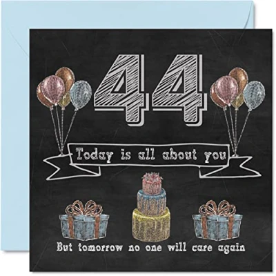 MAKE THEM SMILE WITH THIS FUN BIRTHDAY CARD: This exceptional quality birthday card for her or him shows the design "44 Today is all about you. But tomorrow no one will care again". If you are looking for funny birthday cards for Woman, then then this happy birthday card is bound to make them laugh. Not just for friendship gifts for Woman this could also be for Best Friend, Work Colleague, Dad, Mum, Brother, Sister, Grandad, Nanny, Colleague, Grandma, Uncle, Auntie. WHAT DO YOU GET: The card is printed on one side and BLANK ON THE INSIDE to allow you to write your very own message. The unique fun design is printed on a specially sourced and environmentally responsible board. At 360 microns thick the natural white one-sided gloss board has a quality look and feel. Supplied with a coloured gummed envelope to complement the design and ready to be sealed and sent in the post. 44th birthday card for him, birthday card for Dad. NO INK SMUDGES: There is nothing worse than writing inside a card to find that the shiny surface makes the ink smudge. This is why we use a high quality one sided coated board. The uncoated side will absorb more of the ink from your pen to make smudging a thing of the past. Dad birthday cards, best friend birthday card, birthday card funny, rude birthday cards for Woman. SIZES: Greeting Card = 145mm x 145mm, Envelope = 155mm x 155mm, Card Thickness = 360 micron. Great friend birthday cards, male birthday card, 44th birthday card, happy birthday Mum cards, husband 44th birthday cards, stepdad birthday card. MADE AND QUALITY CHECKED IN THE UK: We print and manufacture all our product right her in the UK so you can be sure of a fast turnaround and a product that is expertly made. Using environmentally responsible premium board our card is conscious of the responsible management of the world's forests - 44th birthday cards for Men, Mens birthday cards, oldi card.