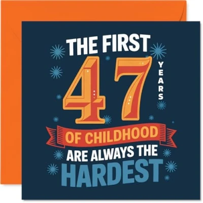 Perfect for anyone who's never really grown up, this card features the witty line 'THE FIRST 47 YEARS OF CHILDHOOD ARE ALWAYS THE HARDEST' in bold. colourful text Bright blue, orange and navy colours make the design pop, giving it a fun and memorable look that stands out on any mantelpiece. Recyclable; printed in UK for a considerate choice Printed on high quality gloss single sided board with an uncoated inside-no smudging when writing inside. Made with FSC board and fully recyclable Blank inside for your own personal message. Comes with a matching envelope, ready to send. The 145mm Square format is convenient to display or post Designed and printed in the UK. Choose this card to bring a smile and a laugh to any milestone celebration-ideal for friends, colleagues or family