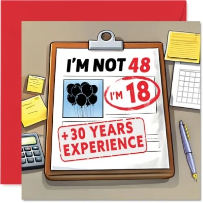 Inject some birthday banter with this card's witty 'I'm not 48, I'm 18 + 30 years experience' message. playfully highlighted on a clipboard surrounded by balloons Features a lively motif of red, black. and white balloons. making it an eye-catching pick for milestone birthdays and sure to get a laugh from friends or colleagues Produced on gloss single sided board and uncoated inside for effortless writing. Crafted from FSC certified board and fully recyclable, so it's kind to the planet too Blank inside for your own message and comes with an envelope, making it easy to send your personal wishes straight away. The 145mm Square format is convenient to display or post Designed and printed in the UK for a quality finish you can trust-ideal for making someone's big day memorable without taking life too seriously