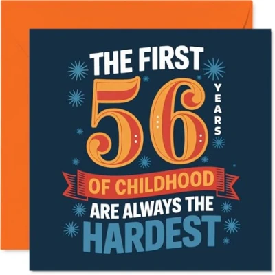 Playful humour meets nostalgia with the cheeky line: 'The first 56 years of childhood are always the hardest', guaranteed to raise a knowing smile Features bold blue and orange colours with standout typography, making it a lively choice that pops on the mantelpiece or office desk. Recyclable; printed in UK for a considerate choice Printed on quality gloss single sided board with an uncoated inside for easy writing. No smudging when writing inside, so your message stays crisp Blank inside, offering plenty of space for your own personal note or in-joke. Comes complete with an envelope for hassle-free gifting. The 145mm Square format is convenient to display or post Designed and printed in the UK using recyclable materials and FSC-certified, so you can feel good about your card choice. Ideal for a mum or dad celebrating a milestone birthday