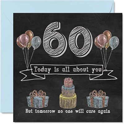 MAKE THEM SMILE WITH THIS FUN BIRTHDAY CARD: This exceptional quality birthday card for her or him shows the design "60 Today is all about you. But tomorrow no one will care again". If you are looking for funny birthday cards for Woman, then then this happy birthday card is bound to make them laugh. Not just for friendship gifts for Woman this could also be for Best Friend, Work Colleague, Dad, Mum, Grandad, Nanny, Grandma, Gran, Colleague, Uncle, Auntie, Cousin. WHAT DO YOU GET: The card is printed on one side and BLANK ON THE INSIDE to allow you to write your very own message. The unique fun design is printed on a specially sourced and environmentally responsible board. At 360 microns thick the natural white one-sided gloss board has a quality look and feel. Supplied with a coloured gummed envelope to complement the design and ready to be sealed and sent in the post. 60th birthday card for him, birthday card for Dad. NO INK SMUDGES: There is nothing worse than writing inside a card to find that the shiny surface makes the ink smudge. This is why we use a high quality one sided coated board. The uncoated side will absorb more of the ink from your pen to make smudging a thing of the past. Dad birthday cards, best friend birthday card, birthday card funny, rude birthday cards for Woman. SIZES: Greeting Card = 145mm x 145mm, Envelope = 155mm x 155mm, Card Thickness = 360 micron. Great friend birthday cards, male birthday card, 60th birthday card, happy birthday Mum cards, husband 60th birthday cards, stepdad birthday card. MADE AND QUALITY CHECKED IN THE UK: We print and manufacture all our product right her in the UK so you can be sure of a fast turnaround and a product that is expertly made. Using environmentally responsible premium board our card is conscious of the responsible management of the world's forests - 60th birthday cards for Men, Mens birthday cards, oldi card.