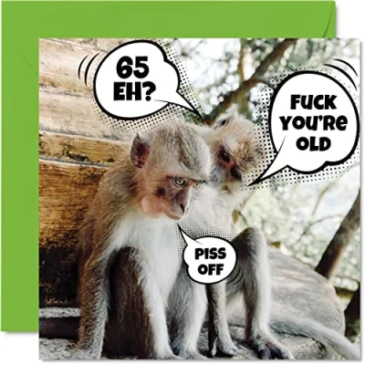 MAKE THEM SMILE WITH THIS FUN BIRTHDAY CARD: This exceptional quality birthday card for her or him shows the design "65 eh?, Fuck you're old, Piss Off". If you are looking for funny birthday cards for Woman, then then this happy birthday card is bound to make them laugh. Not just for friendship gifts for Woman this could also be for Best Friend, Work Colleague, Dad, Mum, Grandad, Nanny, Grandma, Gran, Colleague, Uncle, Auntie, Cousin. WHAT DO YOU GET: The card is printed on one side and BLANK ON THE INSIDE to allow you to write your very own message. The unique fun design is printed on a specially sourced and environmentally responsible board. At 360 microns thick the natural white one-sided gloss board has a quality look and feel. Supplied with a coloured gummed envelope to complement the design and ready to be sealed and sent in the post. 65th birthday card for him, birthday card for Dad. NO INK SMUDGES: There is nothing worse than writing inside a card to find that the shiny surface makes the ink smudge. This is why we use a high quality one sided coated board. The uncoated side will absorb more of the ink from your pen to make smudging a thing of the past. Dad birthday cards, best friend birthday card, birthday card funny, rude birthday cards for Woman. SIZES: Greeting Card = 145mm x 145mm, Envelope = 155mm x 155mm, Card Thickness = 360 micron. Great friend birthday cards, male birthday card, 65th birthday card, happy birthday Mum cards, husband 65th birthday cards, stepdad birthday card. MADE AND QUALITY CHECKED IN THE UK: We print and manufacture all our product right her in the UK so you can be sure of a fast turnaround and a product that is expertly made. Using environmentally responsible premium board our card is conscious of the responsible management of the world's forests - 65th birthday cards for Men, Mens birthday cards, oldi card.