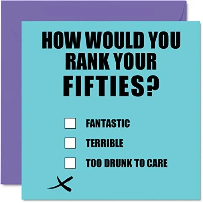 MAKE THEM SMILE WITH THIS FUN BIRTHDAY CARD: This exceptional quality birthday card for her or him shows the design "How would you rank your Fifties, Fantastic, Terrible, Too drunk to care". If you are looking for funny birthday cards for Woman, then then this happy birthday card is bound to make them laugh. Not just for friendship gifts for Woman this could also be for Best Friend, Work Colleague, Dad, Mum, Grandad, Nanny, Grandma, Uncle, Colleague, Auntie, Cousin, Friend. WHAT DO YOU GET: The card is printed on one side and BLANK ON THE INSIDE to allow you to write your very own message. The unique fun design is printed on a specially sourced and environmentally responsible board. At 360 microns thick the natural white one-sided gloss board has a quality look and feel. Supplied with a coloured gummed envelope to complement the design and ready to be sealed and sent in the post. 50th birthday card for him, birthday card for Dad. NO INK SMUDGES: There is nothing worse than writing inside a card to find that the shiny surface makes the ink smudge. This is why we use a high quality one sided coated board. The uncoated side will absorb more of the ink from your pen to make smudging a thing of the past. Dad birthday cards, best friend birthday card, birthday card funny, rude birthday cards for Woman. SIZES: Greeting Card = 145mm x 145mm, Envelope = 155mm x 155mm, Card Thickness = 360 micron. Great friend birthday cards, male birthday card, 50th birthday card, happy birthday Mum cards, husband 50th birthday cards, stepdad birthday card. MADE AND QUALITY CHECKED IN THE UK: We print and manufacture all our product right her in the UK so you can be sure of a fast turnaround and a product that is expertly made. Using environmentally responsible premium board our card is conscious of the responsible management of the world's forests - 50th birthday cards for Men, Mens birthday cards, oldi card.