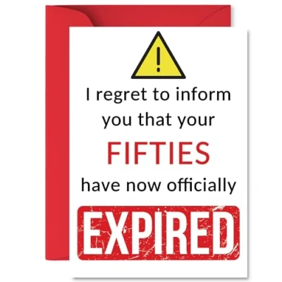 MAKE THEM LAUGH WITH THIS HILARIOUS HAPPY BIRTHDAY CARD: This exceptional quality birthday card for her shows the design 'I regret to inform you that your Fifties have now officially expired". If you are looking for beautiful birthday greetings cards for her or him, then this funny happy birthday card is bound to make them smile. Not just for birthday gifts for her this could also be a birthday card for your Friend, Work Colleague, Cousin, Boss or Neighbour. WHAT DO YOU GET: The card is printed on one side and BLANK ON THE INSIDE to allow you to write your very own message. The unique fun design is printed on a specially sourced and environmentally responsible board. At 360 microns thick the natural white one-sided gloss board has a quality look and feel. Supplied with a coloured gummed envelope to complement the design and ready to be sealed and sent in the post. NO INK SMUDGES: There is nothing worse than writing inside a card to find that the shiny surface makes the ink smudge. This is why we use a high quality one sided coated board. The uncoated side will absorb more of the ink from your pen to make smudging a thing of the past. Happy birthday cards, Friend birthday card, Colleague birthday cards, 60th birthday card for women, 60th birthday cards for men. SIZES: Greeting Card = 148mm x 210mm, Envelope = 150mm x 212mm, Card Thickness = 360 micron. Great friend birthday cards from work colleague. Cousin birthday cards from cousin, birthday card boss, best friend birthday card, friends birthday cards from bestie, special friend birthday cards, colleague card. MADE AND QUALITY CHECKED IN THE UK: We print and manufacture all our product right her in the UK so you can be sure of a fast turnaround and a product that is expertly made. Using the very best premium board our card is conscious of the responsible management of the world's forests.