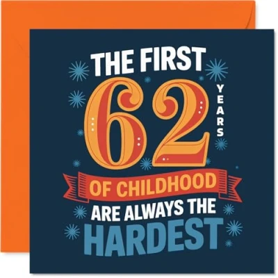 Pokes fun at turning 62 with the cheeky line: "THE FIRST 62 YEARS OF CHILDHOOD ARE ALWAYS THE HARDEST", making it perfect for anyone who refuses to grow up Features bold typography on a navy background with bursts of orange and playful motif details, giving the card instant eye-catching appeal. Recyclable; printed in UK for a considerate choice Printed on quality gloss single sided board with uncoated inside for easy writing. No smudging when writing inside. Made using FSC certified board Blank inside, so you can personalise your message just how you like. Comes with a matching envelope for easy gifting. The 145mm Square format is convenient to display or post Designed and printed in the UK on recyclable materials - a card you can feel good about giving, and one that's sure to stand out on the mantelpiece