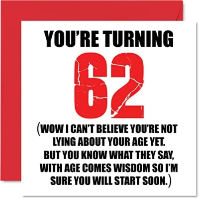 MAKE THEM SMILE WITH THIS FUN BIRTHDAY CARD: This exceptional quality birthday card shows the design "You're turning 62 wow i cant believe your not lying about your age yet. But you know what they say, with age comes wisdom so im sure you will start soon". If you are looking for fun birthday cards for Woman then this happy birthday card is bound to make them laugh. This could also be for Dad, Mum, Grandad, Nanny, Grandma, Gran, Uncle, Auntie, Cousin. WHAT DO YOU GET: The card is printed on one side and @@@PYICQug5Y8KanBe2ON+xlC6UKDmjYaYe@@@ ON THE INSIDE to allow you to write your very own message. The unique fun design is printed on a specially sourced and environmentally responsible board. At 360 microns thick the natural white one-sided gloss board has a quality look and feel. Supplied with a coloured gummed envelope to complement the design and ready to be sealed and sent in the post. 62nd birthday card for him, birthday card for Dad. NO INK SMUDGES: There is nothing worse than writing inside a card to find that the shiny surface makes the ink smudge. This is why we use a high quality one sided coated board. The uncoated side will absorb more of the ink from your pen to make smudging a thing of the past. Dad birthday cards, best friend birthday card, birthday card funny, rude birthday cards for Woman. SIZES: Greeting Card = 145mm x 145mm, Envelope = 155mm x 155mm, Card Thickness = 360 micron. Great friend birthday cards, male birthday card, 62nd birthday card, happy birthday Mum cards, husband 62nd birthday cards, stepdad birthday card, Sixty-Two Birthday Card, 40th birthday gifts for Men, 40th birthday gifts for Woman. MADE AND QUALITY CHECKED IN THE UK: We print and manufacture all our product right her in the UK so you can be sure of a fast turnaround and a product that is expertly made. Using environmentally responsible premium board our card is conscious of the responsible management of the world's forests - 62nd birthday cards for Men, Mens birthday cards, oldi card.