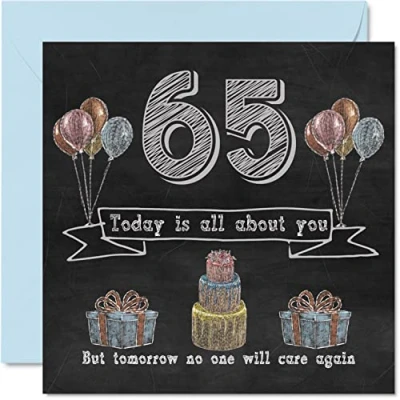 MAKE THEM SMILE WITH THIS FUN BIRTHDAY CARD: This exceptional quality birthday card for her or him shows the design "65 Today is all about you. But tomorrow no one will care again". If you are looking for funny birthday cards for Woman, then then this happy birthday card is bound to make them laugh. Not just for friendship gifts for Woman this could also be for Best Friend, Work Colleague, Dad, Mum, Grandad, Nanny, Grandma, Gran, Colleague, Uncle, Auntie, Cousin. WHAT DO YOU GET: The card is printed on one side and BLANK ON THE INSIDE to allow you to write your very own message. The unique fun design is printed on a specially sourced and environmentally responsible board. At 360 microns thick the natural white one-sided gloss board has a quality look and feel. Supplied with a coloured gummed envelope to complement the design and ready to be sealed and sent in the post. 65th birthday card for him, birthday card for Dad. NO INK SMUDGES: There is nothing worse than writing inside a card to find that the shiny surface makes the ink smudge. This is why we use a high quality one sided coated board. The uncoated side will absorb more of the ink from your pen to make smudging a thing of the past. Dad birthday cards, best friend birthday card, birthday card funny, rude birthday cards for Woman. SIZES: Greeting Card = 145mm x 145mm, Envelope = 155mm x 155mm, Card Thickness = 360 micron. Great friend birthday cards, male birthday card, 65th birthday card, happy birthday Mum cards, husband 65th birthday cards, stepdad birthday card. MADE AND QUALITY CHECKED IN THE UK: We print and manufacture all our product right her in the UK so you can be sure of a fast turnaround and a product that is expertly made. Using environmentally responsible premium board our card is conscious of the responsible management of the world's forests - 65th birthday cards for Men, Mens birthday cards, oldi card.