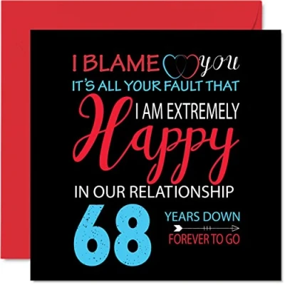 MAKE THEM LAUGH WITH THIS FUNNY ANNIVERSARY CARD FOR YOUR OTHER HALF: This exceptional quality anniversary card for her or him shows the design 'I Blame you, It's all your fault that i am extremely happy in our relationship, 68 Years down Forever to go'. If you are looking for funny anniversary cards for men, then then this happy anniversary card is bound to make them laugh. Not just for relationship gifts for women this could also be for Husband, Wife, Boyfriend, Girlfriend, Partner WHAT DO YOU GET: The card is printed on one side and BLANK ON THE INSIDE to allow you to write your very own message. The unique fun design is printed on a specially sourced and environmentally responsible board. At 360 microns thick the natural white one-sided gloss board has a quality look and feel. Supplied with a coloured gummed envelope to complement the design and ready to be sealed and sent in the post. Wife anniversary card, Boyfriend anniversary card. NO INK SMUDGES: There is nothing worse than writing inside a card to find that the shiny surface makes the ink smudge. This is why we use a high quality one sided coated board. The uncoated side will absorb more of the ink from your pen to make smudging a thing of the past. Anniversary card Wife, anniversary card funny, anniversary card husband. SIZES: Greeting Card = 145mm x 145mm, Envelope = 155mm x 155mm, Card Thickness = 360 micron. Great Wife anniversary cards from Husband, boyfriend or girlfriend anniversary card. Husband anniversary card from wife, anniversary cards for Boyfriend. MADE AND QUALITY CHECKED IN THE UK: We print and manufacture all our product right her in the UK so you can be sure of a fast turnaround and a product that is expertly made. Using environmentally responsible premium board our card is conscious of the responsible management of the world's forests - anniversary cards for Husband, anniversary cards for Wife, funny anniversary cards for her, anniversary card for boyfriend.