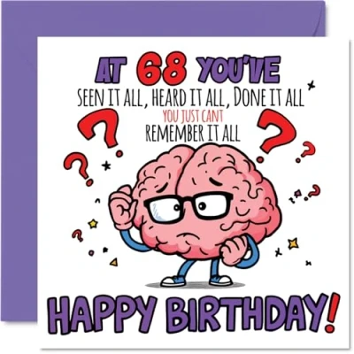 Delivers a hearty laugh with its cartoon brain and tongue-in-cheek joke about remembering it all at 68-perfect for those embracing ageing with humour Features a lively pink and purple design with a cheerful brain character, making it a standout pick for anyone who enjoys a quirky. light-hearted twist Printed on glossy single sided board with an uncoated inside for easy personal messages. No smudging when writing inside. Printed on 360 micron stock for a confident, premium feel Blank inside, so you can pen your own hilarious or heartfelt birthday wishes. Comes with a matching envelope for easy gifting. The 145mm Square format is convenient to display or post Proudly printed in the UK on FSC certified, recyclable -thoughtful on laughs and the environment alike. Ideal for a mum or dad celebrating a milestone birthday