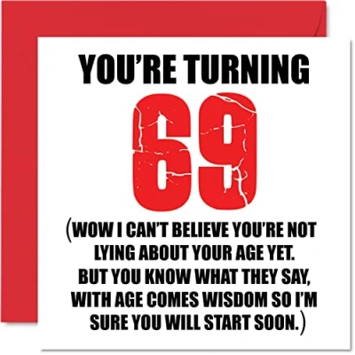 MAKE THEM SMILE WITH THIS FUN BIRTHDAY CARD: This exceptional quality birthday card shows the design "You're turning 69 wow i cant believe your not lying about your age yet. But you know what they say, with age comes wisdom so im sure you will start soon". If you are looking for fun birthday cards for Woman then this happy birthday card is bound to make them laugh. This could also be for Dad, Mum, Grandad, Nanny, Grandma, Gran, Uncle, Auntie, Cousin. WHAT DO YOU GET: The card is printed on one side and BLANK ON THE INSIDE to allow you to write your very own message. The unique fun design is printed on a specially sourced and environmentally responsible board. At 360 microns thick the natural white one-sided gloss board has a quality look and feel. Supplied with a coloured gummed envelope to complement the design and ready to be sealed and sent in the post. 69th birthday card for him, birthday card for Dad. NO INK SMUDGES: There is nothing worse than writing inside a card to find that the shiny surface makes the ink smudge. This is why we use a high quality one sided coated board. The uncoated side will absorb more of the ink from your pen to make smudging a thing of the past. Dad birthday cards, best friend birthday card, birthday card funny, rude birthday cards for Woman. SIZES: Greeting Card = 145mm x 145mm, Envelope = 155mm x 155mm, Card Thickness = 360 micron. Great friend birthday cards, male birthday card, 69th birthday card, happy birthday Mum cards, husband 69th birthday cards, stepdad birthday card, Sixty-Nine Birthday Card, 40th birthday gifts for Men, 40th birthday gifts for Woman. MADE AND QUALITY CHECKED IN THE UK: We print and manufacture all our product right her in the UK so you can be sure of a fast turnaround and a product that is expertly made. Using environmentally responsible premium board our card is conscious of the responsible management of the world's forests - 69th birthday cards for Men, Mens birthday cards, oldi card.