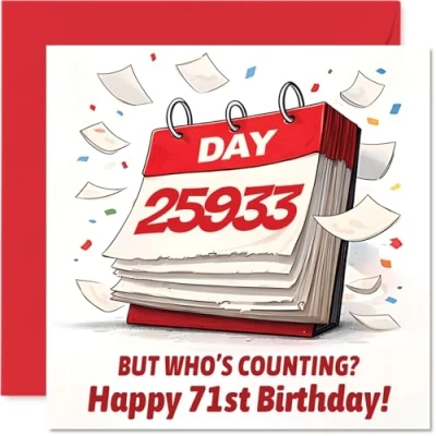Celebrates turning 71 with a wink-features a cheeky calendar and the line 'BUT WHO'S COUNTING?' to raise a smile. Birthday card with a light-hearted design style Standout red and white colours make the calendar motif pop, adding to the fresh and lively feel of the design. Recyclable; printed in UK for a considerate choice Printed on quality gloss single sided board with an uncoated inside-no smudging when writing inside. Recyclable and made using FSC board. Printed on 360 micron stock for a confident, premium feel Blank inside for your own message and comes complete with a coordinating envelope for easy gifting. The 145mm Square format is convenient to display or post Designed and printed in the UK with care, ensuring a memorable card that's ideal for a friend, colleague or anyone who enjoys a laugh. Ideal for a mum or dad celebrating a milestone birthday