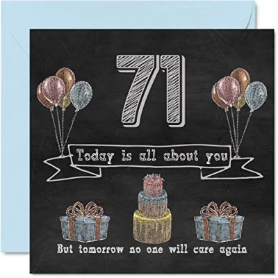 MAKE THEM SMILE WITH THIS FUN BIRTHDAY CARD: This exceptional quality birthday card for her or him shows the design "71 Today is all about you. But tomorrow no one will care again". If you are looking for funny birthday cards for Woman, then then this happy birthday card is bound to make them laugh. Not just for friendship gifts for Woman this could also be for Best Friend, Work Colleague, Dad, Mum, Great Grandad, Grandpa, Nanny, Grandma, Colleague, Gran, Uncle, Auntie. WHAT DO YOU GET: The card is printed on one side and BLANK ON THE INSIDE to allow you to write your very own message. The unique fun design is printed on a specially sourced and environmentally responsible board. At 360 microns thick the natural white one-sided gloss board has a quality look and feel. Supplied with a coloured gummed envelope to complement the design and ready to be sealed and sent in the post. 71st birthday card for him, birthday card for Dad. NO INK SMUDGES: There is nothing worse than writing inside a card to find that the shiny surface makes the ink smudge. This is why we use a high quality one sided coated board. The uncoated side will absorb more of the ink from your pen to make smudging a thing of the past. Dad birthday cards, best friend birthday card, birthday card funny, rude birthday cards for Woman. SIZES: Greeting Card = 145mm x 145mm, Envelope = 155mm x 155mm, Card Thickness = 360 micron. Great friend birthday cards, male birthday card, 71st birthday card, happy birthday Mum cards, husband 71st birthday cards, stepdad birthday card. MADE AND QUALITY CHECKED IN THE UK: We print and manufacture all our product right her in the UK so you can be sure of a fast turnaround and a product that is expertly made. Using environmentally responsible premium board our card is conscious of the responsible management of the world's forests - 71st birthday cards for Men, Mens birthday cards, oldi card.