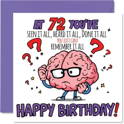 Perfect for raising a chuckle, this card's cartoon brain nails that classic 'can't remember it all' moment at 72 for a playful birthday vibe Features a colourful pink and purple design with a cheeky brain character and a witty caption that's sure to get a grin from anyone celebrating this milestone Printed on quality gloss single sided board with an uncoated inside for easy writing. No smudging when writing inside - perfect for personal messages Blank inside for your own message, and comes with a matching envelope so it's ready to send out straight away. The 145mm Square format is convenient to display or post Designed and printed in the UK using recyclable, FSC-certified - a fun choice you can feel good about giving. Ideal for a mum or dad celebrating a milestone birthday