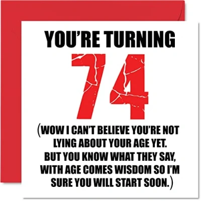 MAKE THEM SMILE WITH THIS FUN BIRTHDAY CARD: This exceptional quality birthday card shows the design "You're turning 74 wow i cant believe your not lying about your age yet. But you know what they say, with age comes wisdom so im sure you will start soon". If you are looking for fun birthday cards for Woman then this happy birthday card is bound to make them laugh. This could also be for Dad, Mum, Great Grandad, Grandpa, Nanny, Grandma, Gran, Uncle, Auntie. WHAT DO YOU GET: The card is printed on one side and BLANK ON THE INSIDE to allow you to write your very own message. The unique fun design is printed on a specially sourced and environmentally responsible board. At 360 microns thick the natural white one-sided gloss board has a quality look and feel. Supplied with a coloured gummed envelope to complement the design and ready to be sealed and sent in the post. 74th birthday card for him, birthday card for Dad. NO INK SMUDGES: There is nothing worse than writing inside a card to find that the shiny surface makes the ink smudge. This is why we use a high quality one sided coated board. The uncoated side will absorb more of the ink from your pen to make smudging a thing of the past. Dad birthday cards, best friend birthday card, birthday card funny, rude birthday cards for Woman. SIZES: Greeting Card = 145mm x 145mm, Envelope = 155mm x 155mm, Card Thickness = 360 micron. Great friend birthday cards, male birthday card, 74th birthday card, happy birthday Mum cards, husband 74th birthday cards, stepdad birthday card, Seventy-Four Birthday Card, 40th birthday gifts for Men, 40th birthday gifts for Woman. MADE AND QUALITY CHECKED IN THE UK: We print and manufacture all our product right her in the UK so you can be sure of a fast turnaround and a product that is expertly made. Using environmentally responsible premium board our card is conscious of the responsible management of the world's forests - 74th birthday cards for Men, Mens birthday cards, oldi card.