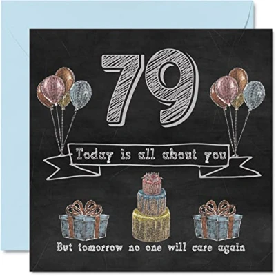 MAKE THEM SMILE WITH THIS FUN BIRTHDAY CARD: This exceptional quality birthday card for her or him shows the design "79 Today is all about you. But tomorrow no one will care again". If you are looking for funny birthday cards for Woman, then then this happy birthday card is bound to make them laugh. Not just for friendship gifts for Woman this could also be for Best Friend, Work Colleague, Dad, Mum, Great Grandad, Grandpa, Nanny, Grandma, Colleague, Gran, Uncle, Auntie. WHAT DO YOU GET: The card is printed on one side and BLANK ON THE INSIDE to allow you to write your very own message. The unique fun design is printed on a specially sourced and environmentally responsible board. At 360 microns thick the natural white one-sided gloss board has a quality look and feel. Supplied with a coloured gummed envelope to complement the design and ready to be sealed and sent in the post. 79th birthday card for him, birthday card for Dad. NO INK SMUDGES: There is nothing worse than writing inside a card to find that the shiny surface makes the ink smudge. This is why we use a high quality one sided coated board. The uncoated side will absorb more of the ink from your pen to make smudging a thing of the past. Dad birthday cards, best friend birthday card, birthday card funny, rude birthday cards for Woman. SIZES: Greeting Card = 145mm x 145mm, Envelope = 155mm x 155mm, Card Thickness = 360 micron. Great friend birthday cards, male birthday card, 79th birthday card, happy birthday Mum cards, husband 79th birthday cards, stepdad birthday card. MADE AND QUALITY CHECKED IN THE UK: We print and manufacture all our product right her in the UK so you can be sure of a fast turnaround and a product that is expertly made. Using environmentally responsible premium board our card is conscious of the responsible management of the world's forests - 79th birthday cards for Men, Mens birthday cards, oldi card.