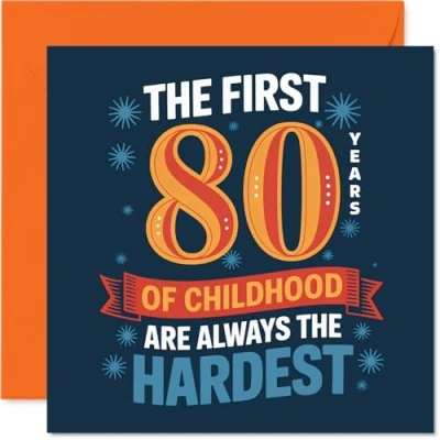 Delivers a cheeky laugh with its witty 'The first 80 years of childhood are always the hardest' punchline in bold type. Birthday card with a light-hearted design style Bright blue, orange, and navy colours make this playful design really pop on the mantelpiece. Recyclable; printed in UK for a considerate choice Printed on gloss single sided board with an uncoated inside. No smudging when writing inside. Made with FSC board and fully recyclable. Printed on 360 micron stock for a confident, premium feel Blank inside for your own message, and comes complete with a coordinating envelope for easy gifting. The 145mm Square format is convenient to display or post Designed and printed in the UK-enjoy a quality card that stands out and brings smiles to any big celebration. Ideal for a mum or dad celebrating a milestone birthday