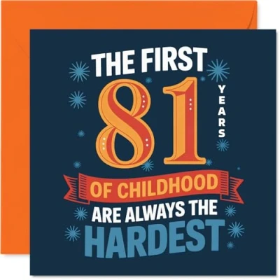 Witty and light-hearted, this card's bold message - 'THE FIRST 81 YEARS OF CHILDHOOD ARE ALWAYS THE HARDEST' - is sure to raise a smile and spark nostalgia Features eye-catching navy, orange. red. blue. and yellow colours with playful typography. creating a fun and cheerful vibe perfect for milestone birthdays Printed on quality gloss single sided board with an uncoated inside for easy writing. No smudging when writing inside. Made using FSC-certified materials for peace of mind Blank inside, so you can add your own cheeky or heartfelt message. Includes a matching envelope for that finishing touch. The 145mm Square format is convenient to display or post Designed and printed in the UK with recyclable materials - ideal for adding a dash of humour to a friend's, mum's or colleague's special day