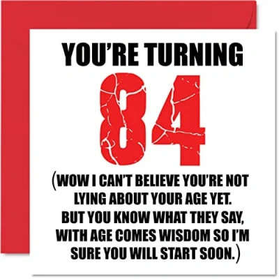 MAKE THEM SMILE WITH THIS FUN BIRTHDAY CARD: This exceptional quality birthday card shows the design "You're turning 84 wow i cant believe your not lying about your age yet. But you know what they say, with age comes wisdom so im sure you will start soon". If you are looking for fun birthday cards for Woman then this happy birthday card is bound to make them laugh. This could also be for Dad, Mum, Great Grandad, Grandpa, Nanny, Grandma, Gran, Uncle, Auntie. WHAT DO YOU GET: The card is printed on one side and BLANK ON THE INSIDE to allow you to write your very own message. The unique fun design is printed on a specially sourced and environmentally responsible board. At 360 microns thick the natural white one-sided gloss board has a quality look and feel. Supplied with a coloured gummed envelope to complement the design and ready to be sealed and sent in the post. 84th birthday card for him, birthday card for Dad. NO INK SMUDGES: There is nothing worse than writing inside a card to find that the shiny surface makes the ink smudge. This is why we use a high quality one sided coated board. The uncoated side will absorb more of the ink from your pen to make smudging a thing of the past. Dad birthday cards, best friend birthday card, birthday card funny, rude birthday cards for Woman. SIZES: Greeting Card = 145mm x 145mm, Envelope = 155mm x 155mm, Card Thickness = 360 micron. Great friend birthday cards, male birthday card, 84th birthday card, happy birthday Mum cards, husband 84th birthday cards, stepdad birthday card, Eighty-Four Birthday Card, 40th birthday gifts for Men, 40th birthday gifts for Woman. MADE AND QUALITY CHECKED IN THE UK: We print and manufacture all our product right her in the UK so you can be sure of a fast turnaround and a product that is expertly made. Using environmentally responsible premium board our card is conscious of the responsible management of the world's forests - 84th birthday cards for Men, Mens birthday cards, oldi card.
