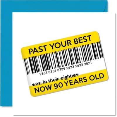MAKE THEM LAUGH WITH THIS HILARIOUS BIRTHDAY CARD: This exceptional quality birthday card for Them shows a design of a scannable barcode with the text: Past Your Best Now 90 Years Old. If you are looking for a beautiful birthday card for them, then this happy birthday card is bound to make them smile. Not just a birthday card for neighbour this could also be a Bday card for colleagues. WHAT DO YOU GET: The card is printed on one side and BLANK ON THE INSIDE to allow you to write your very own message. The unique fun design is printed on a specially sourced and environmentally responsible board. At 360 microns thick the natural white one-sided gloss board has a quality look and feel. Supplied with a coloured gummed envelope to complement the design and ready to be sealed and sent in the post. NO INK SMUDGES: There is nothing worse than writing inside a card to find that the shiny surface makes the ink smudge. This is why we use a high quality one sided coated board. The uncoated side will absorb more of the ink from your pen to make smudging a thing of the past. Bday cards, Birthday cards from Colleague. SIZES: Greeting Card = 145mm x 145mm, Envelope = 155mm x 155mm, Card Thickness = 360 micron. Happy Birthday cards, employee Birthday card, family cards Birthday, Birthday card colleague, happy Bday neighbour from Friends gifts, happy Birthday cousin card, Bday cards friend, friend gifts from Colleague. MADE AND QUALITY CHECKED IN THE UK: We print and manufacture all our product right her in the UK so you can be sure of a fast turnaround and a product that is expertly made. Using environmentally responsible premium board our card is conscious of the responsible management of the worlds forests - happy birthday card uncle, rude birthday cards.