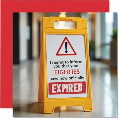 MAKE THEM LAUGH WITH THIS HILARIOUS HAPPY BIRTHDAY CARD: This exceptional quality birthday card for her shows the design 'I regret to inform you that your Eighties have now officially expired". If you are looking for beautiful birthday greetings cards for her or him, then this funny happy birthday card is bound to make them smile. Not just for birthday gifts for her this could also be a birthday card for your Great Grandpa, Nana, Gramps, Step Uncle or Auntie. WHAT DO YOU GET: The card is printed on one side and BLANK ON THE INSIDE to allow you to write your very own message. The unique fun design is printed on a specially sourced and environmentally responsible board. At 360 microns thick the natural white one-sided gloss board has a quality look and feel. Supplied with a coloured gummed envelope to complement the design and ready to be sealed and sent in the post. NO INK SMUDGES: There is nothing worse than writing inside a card to find that the shiny surface makes the ink smudge. This is why we use a high quality one sided coated board. The uncoated side will absorb more of the ink from your pen to make smudging a thing of the past. Happy birthday cards, Great Grandad birthday card, Great Grandma birthday cards, 90th birthday card for women, 90th birthday cards for men. SIZES: Greeting Card = 145mm x 145mm, Envelope = 155mm x 155mm, Card Thickness = 360 micron. Great Grandad birthday cards from Great Grandson and Great Granddaughter. Great Grandma birthday cards from Grandson, birthday card Great Granny, Granny birthday card, Grandpa birthday cards from Great Granddaughter, special Grandparent birthday cards, Nanny card. MADE AND QUALITY CHECKED IN THE UK: We print and manufacture all our product right her in the UK so you can be sure of a fast turnaround and a product that is expertly made. Using the very best Forest Stewardship Council certified board our card is conscious of the responsible management of the world's forests.