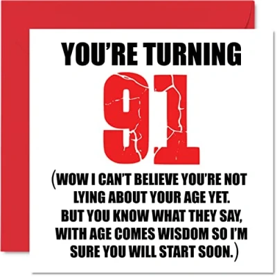 MAKE THEM SMILE WITH THIS FUN BIRTHDAY CARD: This exceptional quality birthday card shows the design "You're turning 91 wow i cant believe your not lying about your age yet. But you know what they say, with age comes wisdom so im sure you will start soon". If you are looking for fun birthday cards for Woman then this happy birthday card is bound to make them laugh. This could also be for Great Grandad, Grandpa, Nanny, Grandma, Nan, Gran, Granny, Dad, Mum. WHAT DO YOU GET: The card is printed on one side and BLANK ON THE INSIDE to allow you to write your very own message. The unique fun design is printed on a specially sourced and environmentally responsible board. At 360 microns thick the natural white one-sided gloss board has a quality look and feel. Supplied with a coloured gummed envelope to complement the design and ready to be sealed and sent in the post. 91st birthday card for him, birthday card for Great Grandad. NO INK SMUDGES: There is nothing worse than writing inside a card to find that the shiny surface makes the ink smudge. This is why we use a high quality one sided coated board. The uncoated side will absorb more of the ink from your pen to make smudging a thing of the past. Great Grandad birthday cards, best friend birthday card, birthday card funny, rude birthday cards for Woman. SIZES: Greeting Card = 145mm x 145mm, Envelope = 155mm x 155mm, Card Thickness = 360 micron. Great friend birthday cards, male birthday card, 91st birthday card, happy birthday Grandpa cards, husband 91st birthday cards, stepdad birthday card, Ninety-One Birthday Card, 40th birthday gifts for Men, 40th birthday gifts for Woman. MADE AND QUALITY CHECKED IN THE UK: We print and manufacture all our product right her in the UK so you can be sure of a fast turnaround and a product that is expertly made. Using environmentally responsible premium board our card is conscious of the responsible management of the world's forests - 91st birthday cards for Men, Mens birthday cards, oldi card.