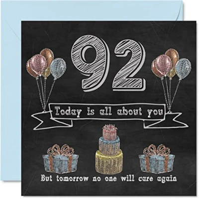 MAKE THEM SMILE WITH THIS FUN BIRTHDAY CARD: This exceptional quality birthday card for her or him shows the design "92 Today is all about you. But tomorrow no one will care again". If you are looking for funny birthday cards for Woman, then then this happy birthday card is bound to make them laugh. Not just for friendship gifts for Woman this could also be for Best Friend, Work Colleague, Great Grandad, Grandpa, Nanny, Grandma, Nan, Gran, Colleague, Granny, Dad, Mum. WHAT DO YOU GET: The card is printed on one side and BLANK ON THE INSIDE to allow you to write your very own message. The unique fun design is printed on a specially sourced and environmentally responsible board. At 360 microns thick the natural white one-sided gloss board has a quality look and feel. Supplied with a coloured gummed envelope to complement the design and ready to be sealed and sent in the post. 92nd birthday card for him, birthday card for Great Grandad. NO INK SMUDGES: There is nothing worse than writing inside a card to find that the shiny surface makes the ink smudge. This is why we use a high quality one sided coated board. The uncoated side will absorb more of the ink from your pen to make smudging a thing of the past. Great Grandad birthday cards, best friend birthday card, birthday card funny, rude birthday cards for Woman. SIZES: Greeting Card = 145mm x 145mm, Envelope = 155mm x 155mm, Card Thickness = 360 micron. Great friend birthday cards, male birthday card, 92nd birthday card, happy birthday Grandpa cards, husband 92nd birthday cards, stepdad birthday card. MADE AND QUALITY CHECKED IN THE UK: We print and manufacture all our product right her in the UK so you can be sure of a fast turnaround and a product that is expertly made. Using environmentally responsible premium board our card is conscious of the responsible management of the world's forests - 92nd birthday cards for Men, Mens birthday cards, oldi card.