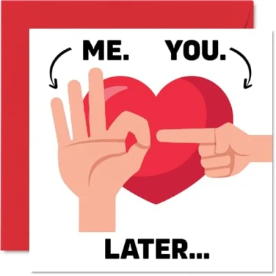 MAKE THEM CHUCKLE WITH THIS FUNNY CARD FOR YOUR OTHER HALF: This exceptional quality cheeky card for him shows the design of two suggestive hand signals with the words "Me...You...Later...". If you are looking for funny anniversary cards for men, then this amusing card is bound to make them laugh. Not just for relationship gifts for men this could also be for Husband, Boyfriend, Partner or Companion. WHATS INSIDE - the vibrant art style theme continues inside with the words with simple heart designs - as seen in the second image. There's ample space for your own personal message. Crafted on a 360-micron thick, environmentally responsible board, this one-sided gloss board offers a luxurious look and feel. Paired with a colored gummed envelope that complements the design, it's ready to be sealed and sent, making it a truly special gesture. NO INK SMUDGES: There is nothing worse than writing inside a card to find that the shiny surface makes the ink smudge. This is why we use a high quality one sided coated board. The uncoated side will absorb more of the ink from your pen to make smudging a thing of the past. Anniversary card Husband, anniversary card funny, anniversary card husband. SIZES: Greeting Card = 145mm x 145mm, Envelope = 155mm x 155mm, Card Thickness = 360 micron. Great Husband anniversary cards from Wife, Boyfriend anniversary card. MADE AND QUALITY CHECKED IN THE UK: We print and manufacture all our product right her in the UK so you can be sure of a fast turnaround and a product that is expertly made. Using environmentally responsible premium board our card is conscious of the responsible management of the world's forests - anniversary cards for Husband, anniversary cards for boyfriend, funny anniversary cards for him, anniversary card for partner.