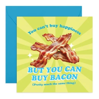 Funny Bacon Greeting Card 'Bacon Happiness' Jokes for him, her, husband, wife, friends, meat and lovers is Enough Comes with Fun Stickers