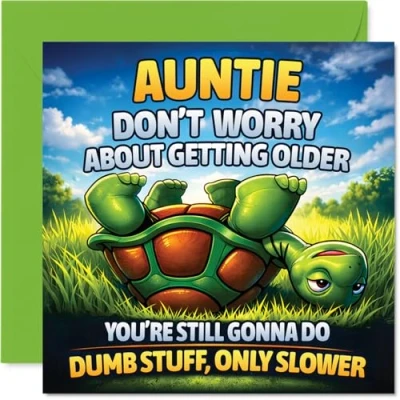 Funny Birthday Card for Auntie Getting Older Just Means Doing Daft Things Slower Cheeky Turtle Illustration Brings a Playful Twist 145mm Square, Envelope Included