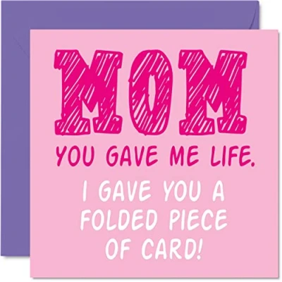 MAKE THEM LAUGH WITH THIS FUNNY MOTHERS DAY CARD: This exceptional quality birthday card for her shows the design "Mom You Gave Me Life. I Gave You a Folded Piece of Card!". If you are looking for funny birthday greetings cards for Mom, then then this happy birthday card is bound to make them laugh. Not just for friendship gifts for women this could also be a birthday card for Mum, Mother, Mummy, Mom, Mama, Momma, or Mommy. WHAT DO YOU GET: The card is printed on one side and BLANK ON THE INSIDE to allow you to write your very own message. The unique fun design is printed on a specially sourced and environmentally responsible board. At 360 microns thick the natural white one-sided gloss board has a quality look and feel. Supplied with a coloured gummed envelope to complement the design and ready to be sealed and sent in the post. Gifts for Mum Mothers Day, Mom card. NO INK SMUDGES: There is nothing worse than writing inside a card to find that the shiny surface makes the ink smudge. This is why we use a high quality one sided coated board. The uncoated side will absorb more of the ink from your pen to make smudging a thing of the past. Happy birthday Mom cards, Momma birthday card, Mom birthday cards. Mother’s Day card for Mom, Mothers Day card funny rude. SIZES: Greeting Card = 145mm x 145mm, Envelope = 155mm x 155mm, Card Thickness = 360 micron. Great Mom birthday cards from Son or Daughter. Mom birthday cards from Daughter, birthday cards for Mom, Mother birthday card, Mom birthday cards from Son, Mom cards birthday, Mum 50th birthday card, birthday card Mom from Daughter, Mothers Day card funny cheeky, Momma Mothers Day card, funny Mothers Day cards. MADE AND QUALITY CHECKED IN THE UK: We print and manufacture all our product right her in the UK so you can be sure of a fast turnaround and a product that is expertly made. Using environmentally responsible premium board our card is conscious of the responsible management of the world's forests - Mothers Day funny card, happy Mothers Day gifts.