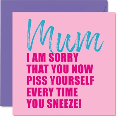 MAKE THEM LAUGH WITH THIS FUNNY MOTHERS DAY CARD: This exceptional quality birthday card for her shows the design "Mum I Am Sorry That You Now Piss Youself Every Time You Sneeze!". If you are looking for funny birthday greetings cards for Mum, then then this happy birthday card is bound to make them laugh. Not just for friendship gifts for women this could also be a birthday card for Mum, Mother, Mummy, Mom, Mama, Mama, or Mommy. WHAT DO YOU GET: The card is printed on one side and BLANK ON THE INSIDE to allow you to write your very own message. The unique fun design is printed on a specially sourced and environmentally responsible board. At 360 microns thick the natural white one-sided gloss board has a quality look and feel. Supplied with a coloured gummed envelope to complement the design and ready to be sealed and sent in the post. NO INK SMUDGES: There is nothing worse than writing inside a card to find that the shiny surface makes the ink smudge. This is why we use a high quality one sided coated board. The uncoated side will absorb more of the ink from your pen to make smudging a thing of the past. Happy birthday Mum cards, Mam birthday card, Mom birthday cards. SIZES: Greeting Card = 145mm x 145mm, Envelope = 155mm x 155mm, Card Thickness = 360 micron. Great Mum birthday cards from Son or Daughter. Mum birthday cards from Daughter, birthday cards for Mum, birthday card Mum, Mother birthday card, Mum birthday cards from Son, Mum cards birthday, special Mum birthday cards, Mum 50th birthday card, birthday card Mum from Daughter. MADE AND QUALITY CHECKED IN THE UK: We print and manufacture all our product right her in the UK so you can be sure of a fast turnaround and a product that is expertly made. Using environmentally responsible premium board our card is conscious of the responsible management of the world's forests - birthday cards Mum, birthday card Mother, Step Mum birthday card, Mums birthday card.