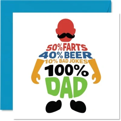 Puts a smile on his face with its witty tongue-in-cheek percentages - the 50% farts, 40% beer, 10% bad jokes theme is pure comedy gold. Birthday card with a light-hearted design style Features a vibrant mix of red, blue, green, orange and black, making it stand out on any mantelpiece and perfect for dads with a sense of humour Printed on a gloss single sided board with an uncoated inside, so no smudging when writing inside. Made using FSC certified board and fully recyclable Blank inside for your own message, and comes with a quality envelope - ready for you to personalise for your favourite dad or father figure. The 145mm Square format is convenient to display or post Proudly printed in the UK - designed to deliver a good chuckle and crafted to make his day that bit more memorable and fun