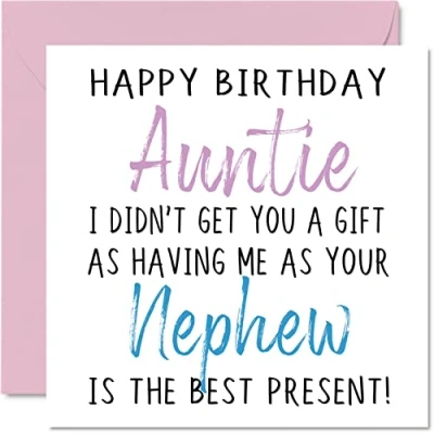 MAKE THEM SMILE WITH THIS HILARIOUS HAPPY BIRTHDAY CARD: This exceptional quality birthday card for her shows the design "Happy Birthday Auntie, I didn't get you a Gift as having me as your Nephew is the best Present!". If you are looking for funny birthday greetings cards for her then this happy birthday card is bound to make them laugh. Not just for birthday day gifts for Auntie this could also be for Aunt or Aunty, Parents Sister or Friend WHAT DO YOU GET: The card is printed on one side and BLANK ON THE INSIDE to allow you to write your very own message. The unique fun design is printed on a specially sourced and environmentally responsible board. At 360 microns thick the natural white one-sided gloss board has a quality look and feel. Supplied with a coloured gummed envelope to complement the design and ready to be sealed and sent in the post. NO INK SMUDGES: There is nothing worse than writing inside a card to find that the shiny surface makes the ink smudge. This is why we use a high quality one sided coated board. The uncoated side will absorb more of the ink from your pen to make smudging a thing of the past. Happy Birthday Auntie Birthday cards. 30th birthday gifts for Aunt SIZES: Greeting Card = 145mm x 145mm, Envelope = 155mm x 155mm, Card Thickness = 360 micron. Great Birthday Cards from Nephew. Birthday cards from Nephew 40th birthday card. MADE AND QUALITY CHECKED IN THE UK: We print and manufacture all our product right here in the UK so you can be sure of a fast turnaround and a product that is expertly made. Using environmentally responsible premium board our card is conscious of the responsible management of the world's forests - birthday cards Auntie, Uncle, Aunty, Aunt, Dad, Mom, Brother, Sister, Grandma, Grandad Special birthday card.